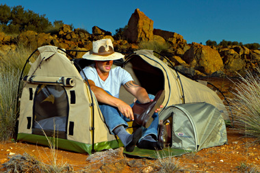 Outstanding in wet conditions, the SkyDome features a heavy duty 820gsm PVC base, with welded seams for waterproofing. Extending 75mm up the side of the swag, the waterproof base prevents water leakage from puddles or mild flooding, while the SkyDome’s heavy-duty canvas top is also waterproof and heat reflective. Finished in a heavy duty 450gsm water and rot-proofed canvas, all doors and windows feature YKK zips, while a rain gutter is incorporated into the main entry door to inhibit water ingress. Providing comfort, the 75mm corrugated foam mattress features anti-microbial additives, while the cover is machine washable. A number of internal storage devices are also integrated in the swag, including a wide-brim hat holder in the head awning that’s accessible from inside or outside the swag.