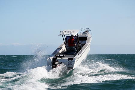 Rod holders, livebait tanks, in-floor fish storage tanks, berley buckets, large-volume storage pockets, navigation lights, dual battery systems, step-through transoms, marlin boards / swim platforms, swim / dive ladders and, of course, easy-to-clean checkerplate self-draining decks are among a long list of fishing-related features.