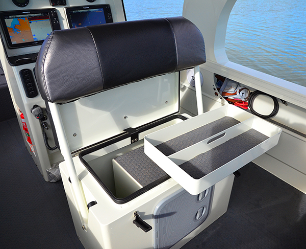 That really does sum up these boats. By golly, they’re not cheap; that is, compared to any other aluminium trailer boat of similar size that I know of. But compared to what you get in materials, construction, finish, attention to detail and performance, they are definitely not expensive. Read Ocean Master to remind yourself of the old adage that you pay for what you get. Most certainly, in respect of our test boat, the layout and finish are nothing short of spectacular. It exudes comfort from bow to stern, yet it is an incredibly-well-designed offshore fishing boat. Just the amount of rod storage in the launchers and the dedicated working-rod holder positions would make it a joy to game fish out of. The massive struts supporting the targa top certainly beckon the addition of outrigger poles. And make no mistake about it: fitted without a targa top in a more open plan, you could manoeuvre and fish happily from the big Ocean Master on most barra waters in northern Australia. I’m basing that on my own experience with the Twister which is brilliant on barra water; after all, the Vortex has the same beam and depth – it’s just that it’s 900mm longer.