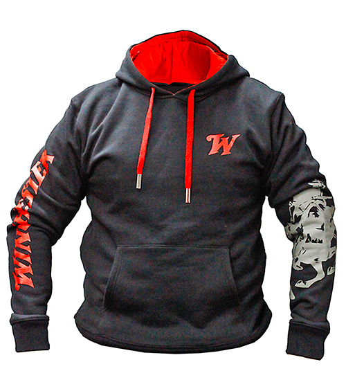 HOODIE FEATURES: • Huge Winchester wordmark on the right sleeve • Horse & Rider print on sleeve • Winchester logo on left breast • Kangaroo pocket • Cotton lined • 350 GSM 80% Cotton, 20% Poly • Anti-pill fabric